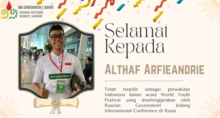 Salah satu murid dari SMA Cenderawasih 1 Jakarta yaitu Althaf Arfiandrie kelas XI-A telah terpilih sebagai perwakilan Indonesia dalam acara World Youth Festival yang diselenggarakan oleh Russian Government bidang Internasional Conference di Rusia pada tanggal 28 Februari 2024 hingga 8 Maret 2024 dan diikuti oleh 20 ribu peserta dengan rentang usia 18-35 tahun dari 180 negara.